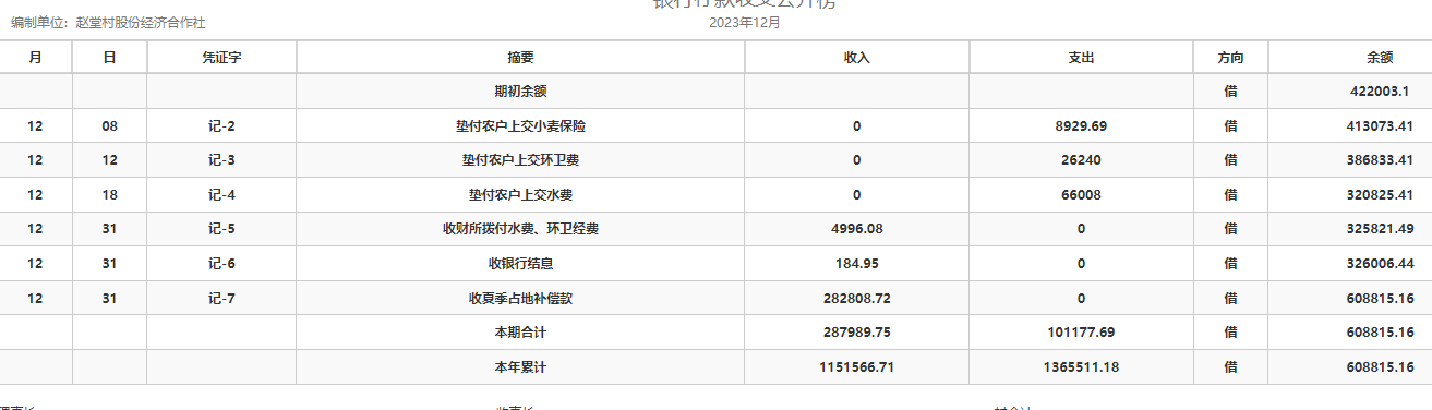 阎楼镇赵堂村2023年12月份账目收支明细表