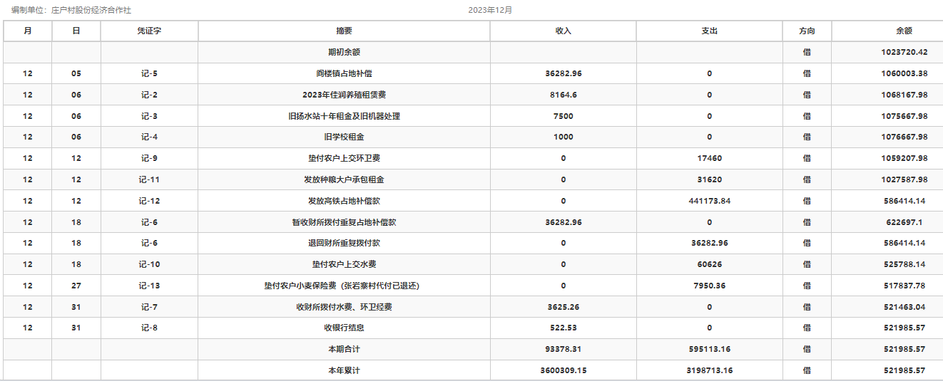 阎楼镇庄户村2023年12月份账目收支明细表