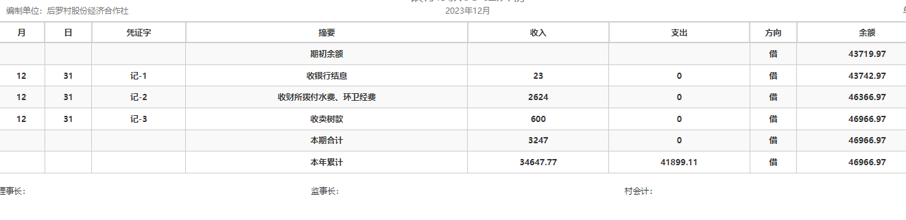 阎楼镇后罗村2023年12月份账目收支明细表