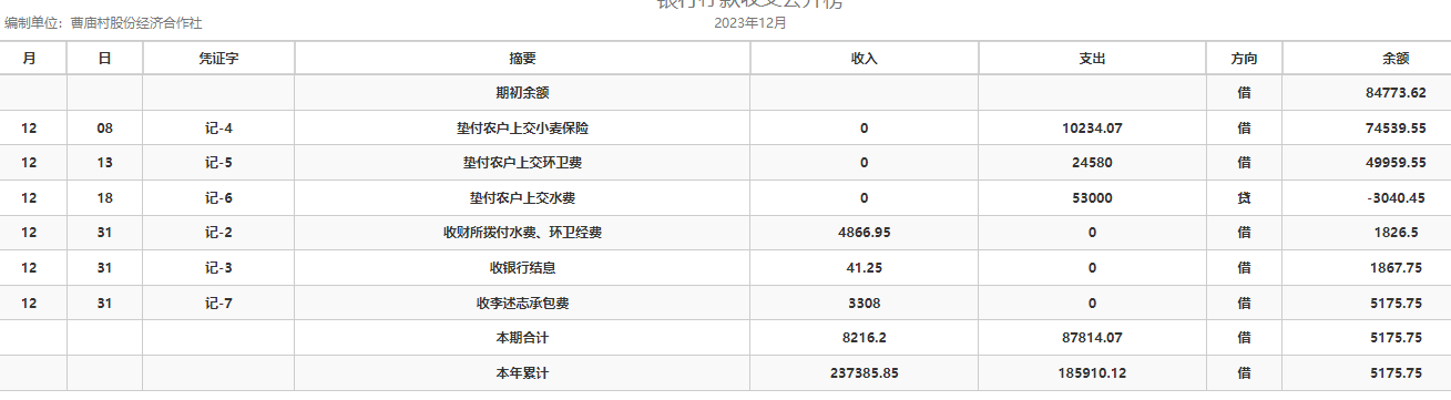 阎楼镇曹庙村2023年12月份账目收支明细表