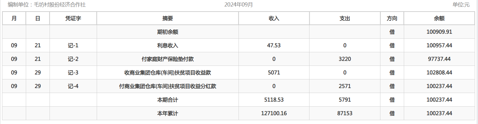 阿城镇毛坊村2024年9月份账目收支明细表