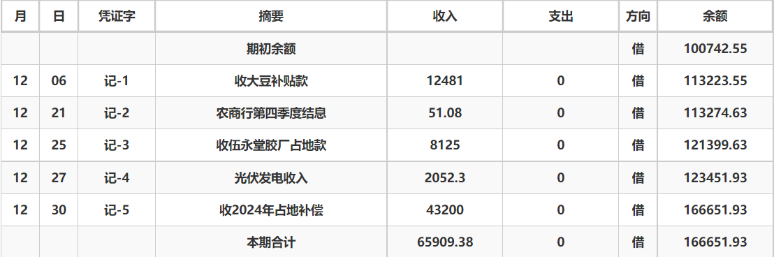 阿城镇东王庄村2024年12月份账目收支明细表