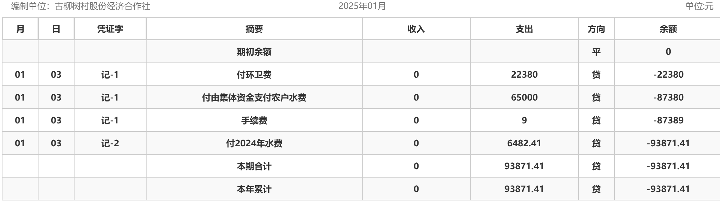 阿城镇古柳树村2025年1月份账目收支明细表