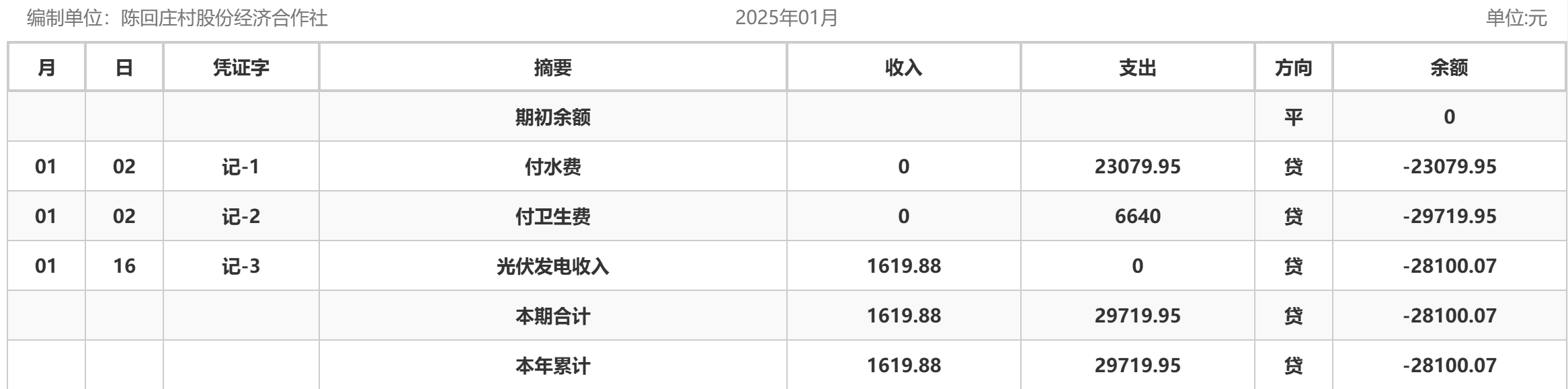 阿城镇陈回庄村2025年1月份账目收支明细表