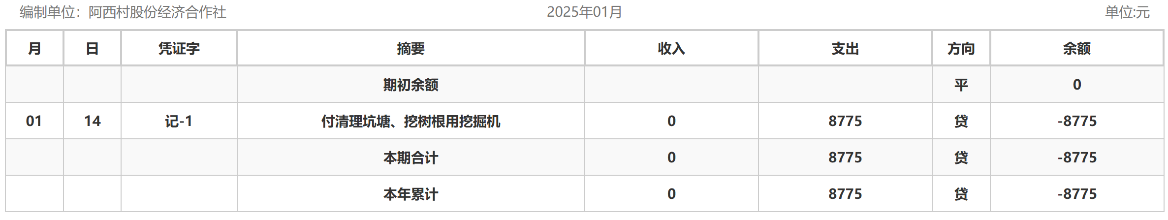 阿城镇阿西村2025年1月份账目收支明细表