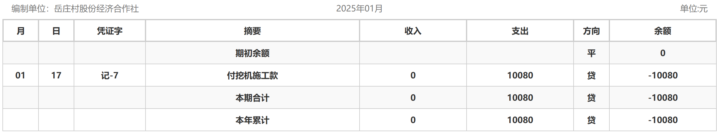 阿城镇岳庄村2025年1月份账目收支明细表