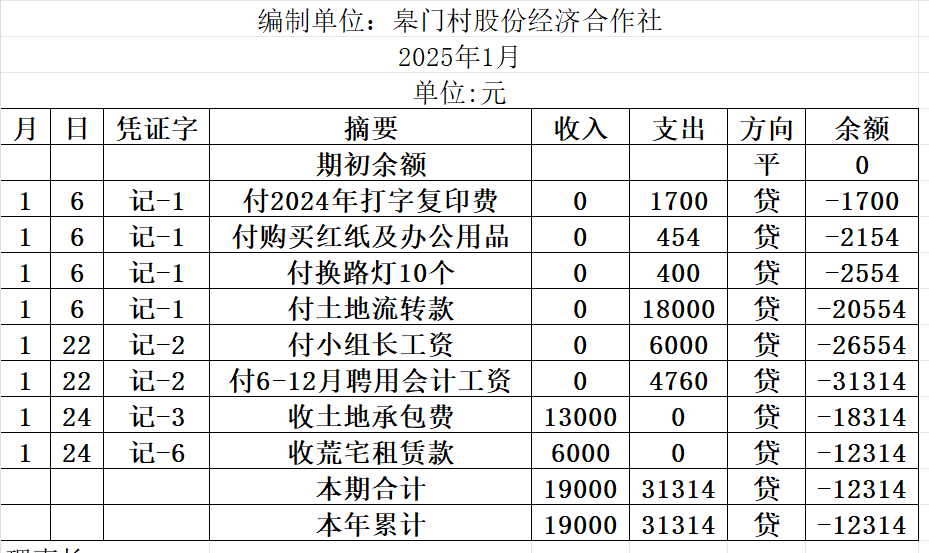 阿城镇皋门村2025年1月份账目收支明细表