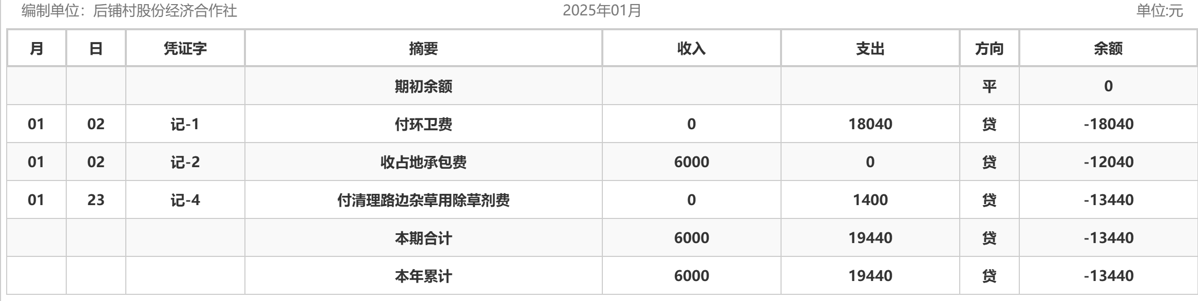 阿城镇后铺村2025年1月份账目收支明细表