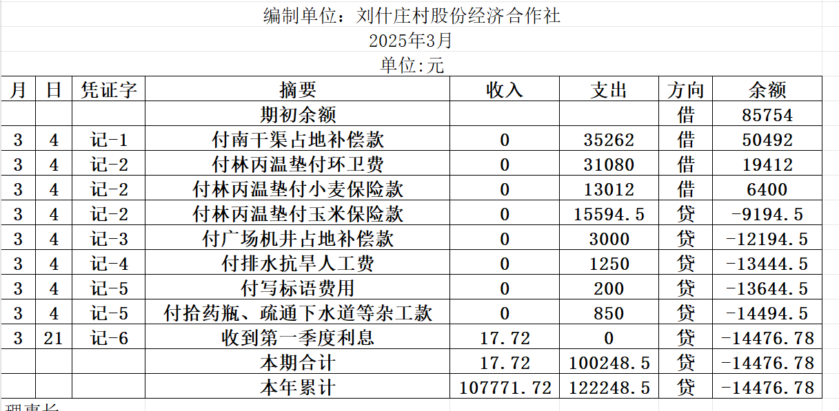 阿城镇刘什庄村2025年3月份账目收支明细表
