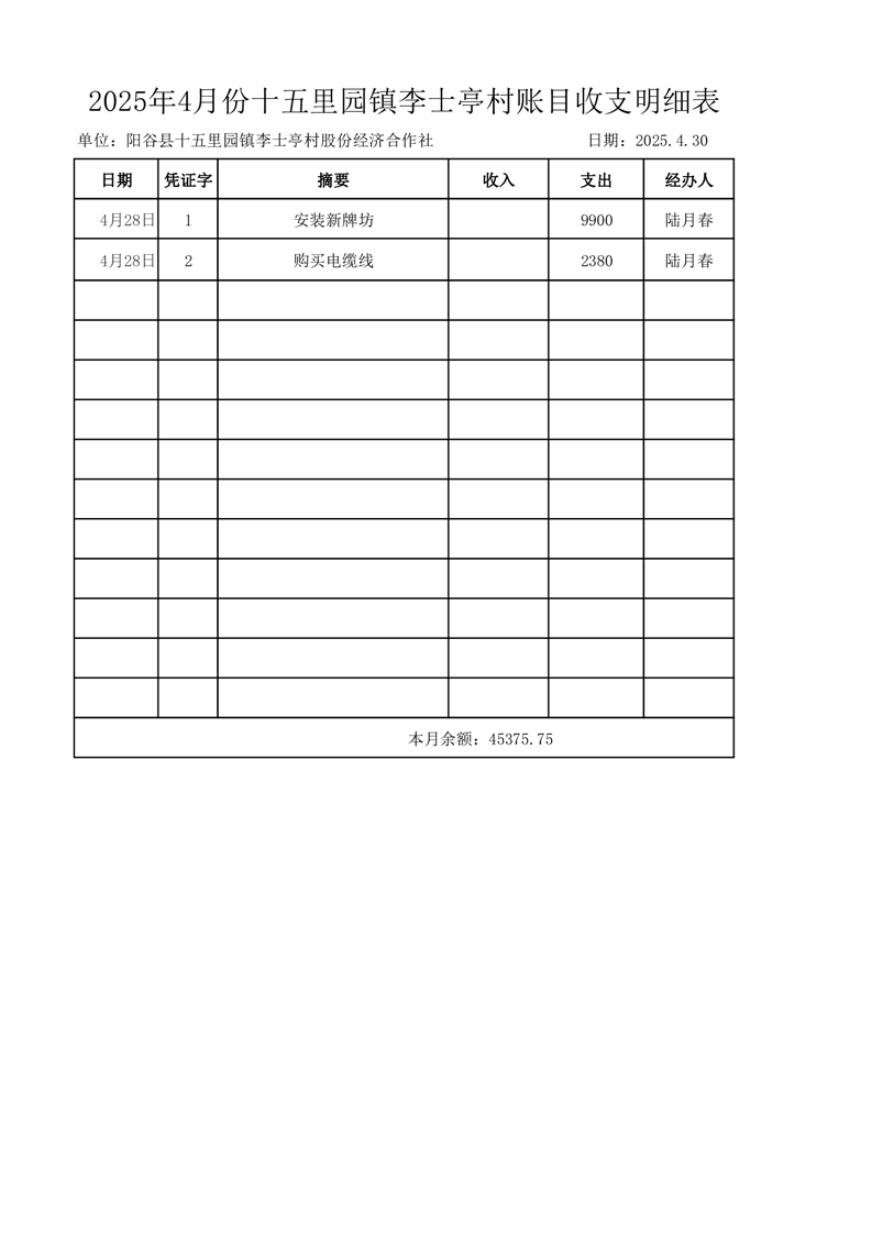 2025年4月份十五里园镇李士亭村账目收支明细表