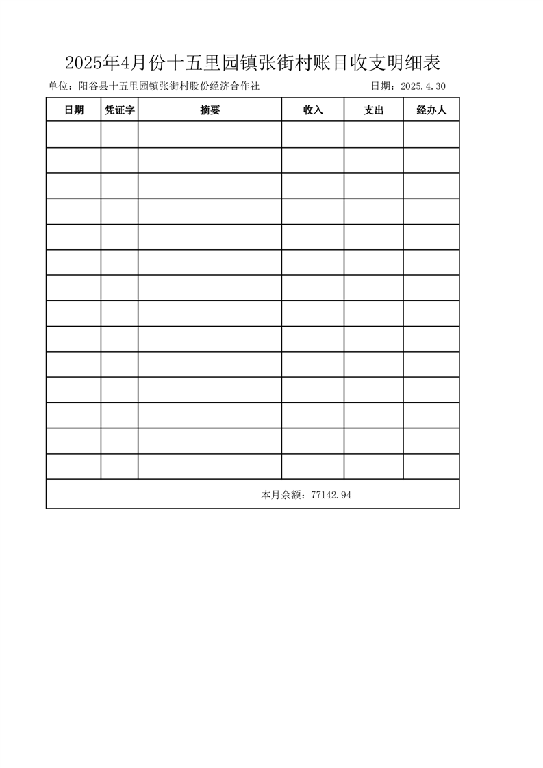 2025年4月份十五里园镇张街村账目收支明细表