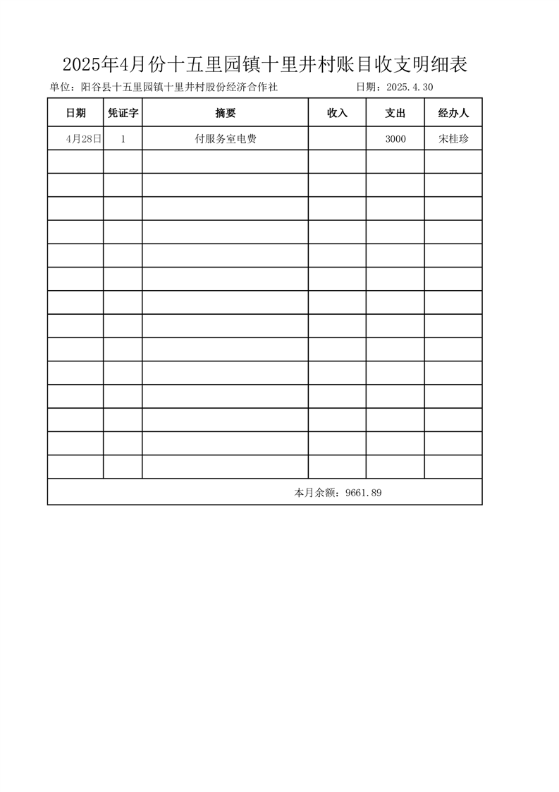 2025年4月份十五里园镇十里井村账目收支明细表