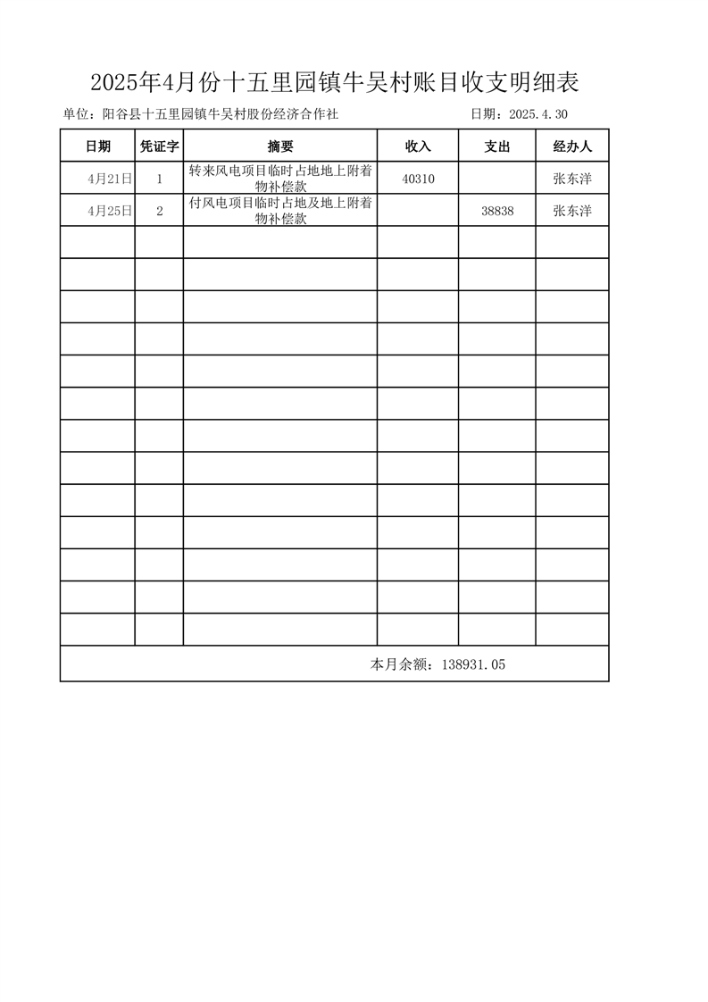 2025年4月份十五里园镇牛吴村账目收支明细表