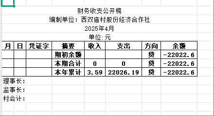 阿城镇西双庙村2025年4月份账目收支明细表
