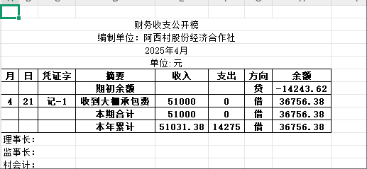 阿城镇阿西村2025年4月份账目收支明细表