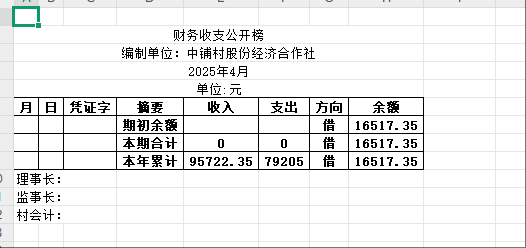 阿城镇中铺村2025年4月份账目收支明细表