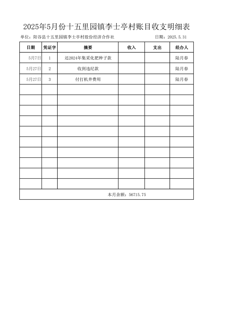 2025年5月份十五里园镇李士亭村账目收支明细表