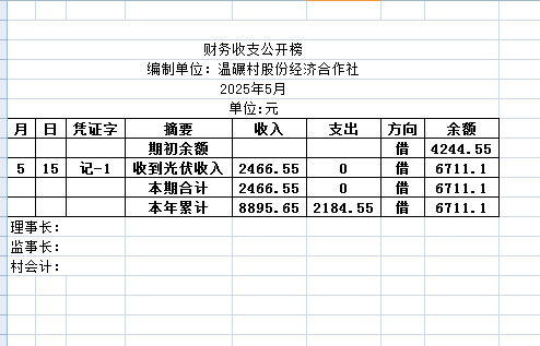 阿城镇温碾村2025年5月份账目收支明细表