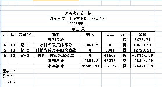 阿城镇于庄村2025年5月份账目收支明细表