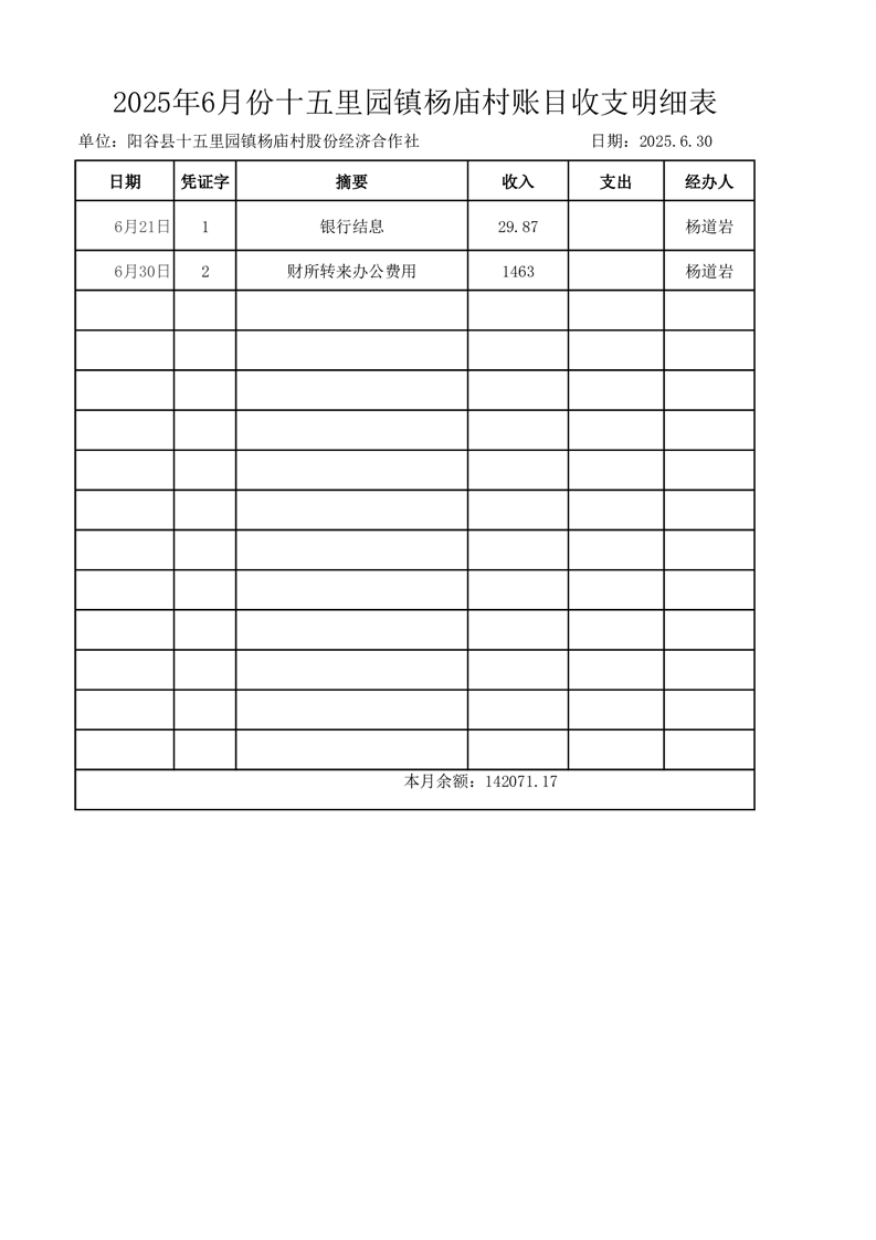 2025年6月份十五里园镇杨庙村账目收支明细表