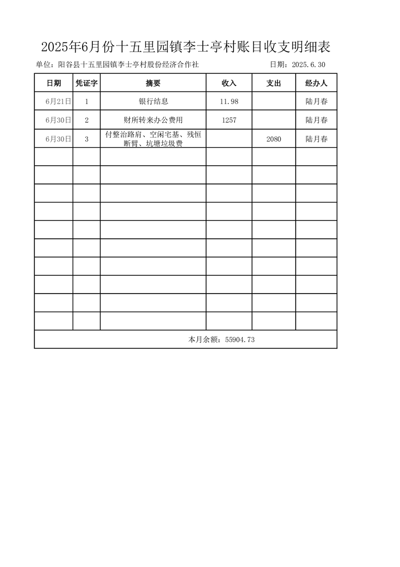 2025年6月份十五里园镇李士亭村账目收支明细表