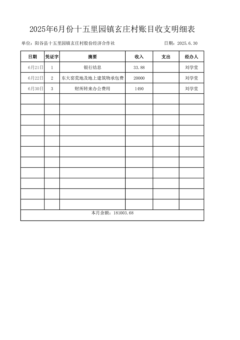 2025年6月份十五里园镇玄庄村账目收支明细表