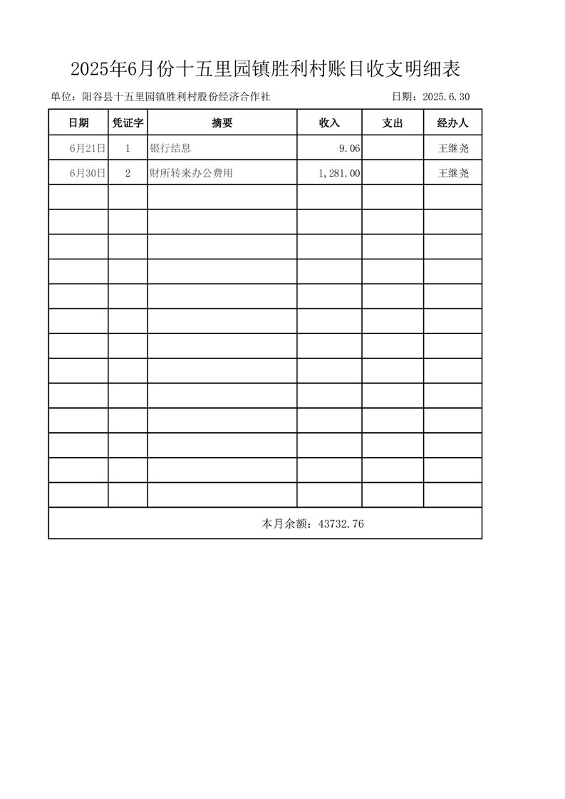 2025年6月份十五里园镇胜利村账目收支明细表