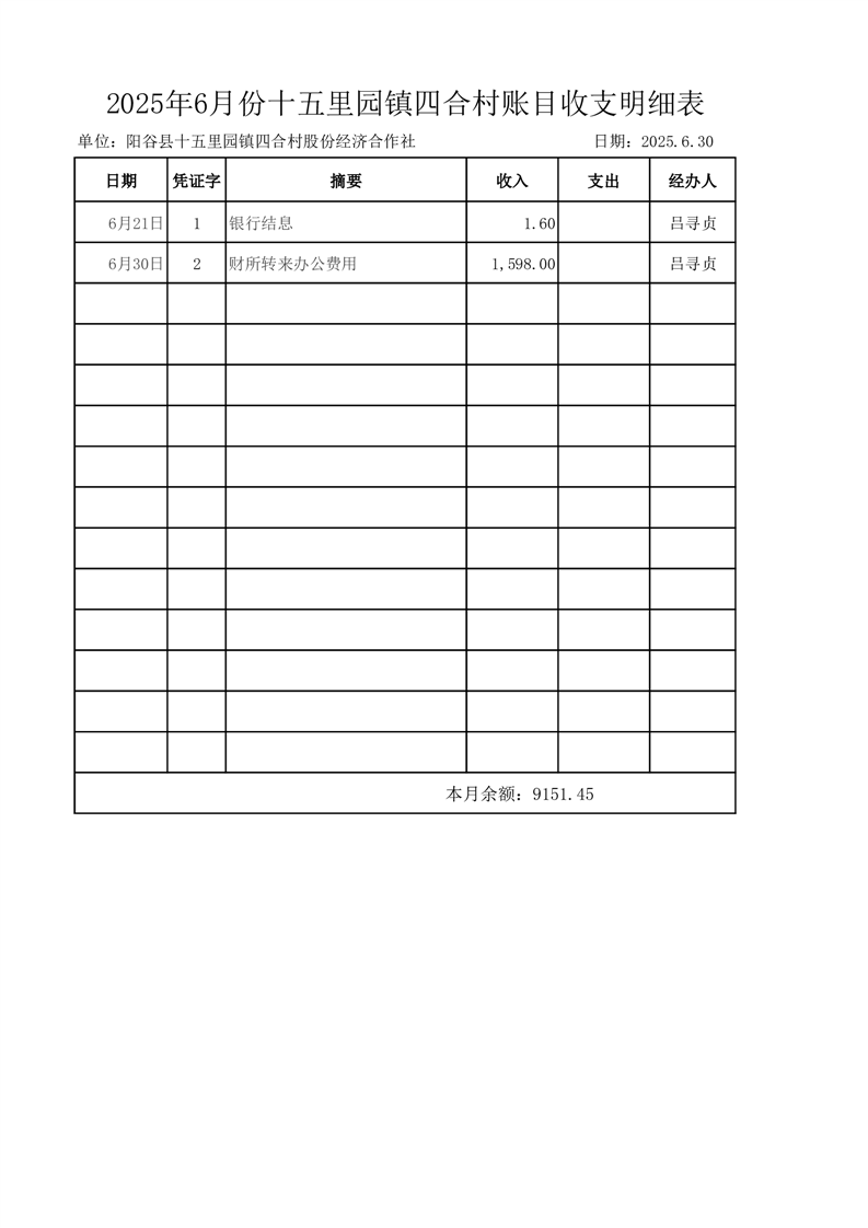 2025年6月份十五里园镇四合村账目收支明细表