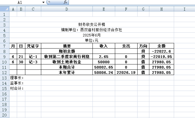 阿城镇西双庙村2025年6月份账目收支明细表