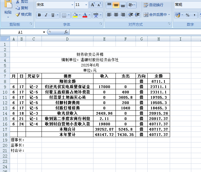阿城镇温碾村2025年6月份账目收支明细表