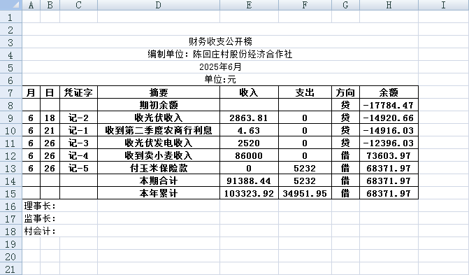 阿城镇陈回庄村2025年6月份账目收支明细表