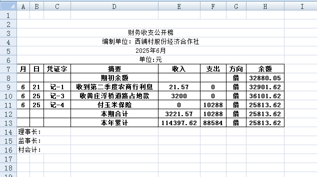 阿城镇西铺村2025年6月份账目收支明细表