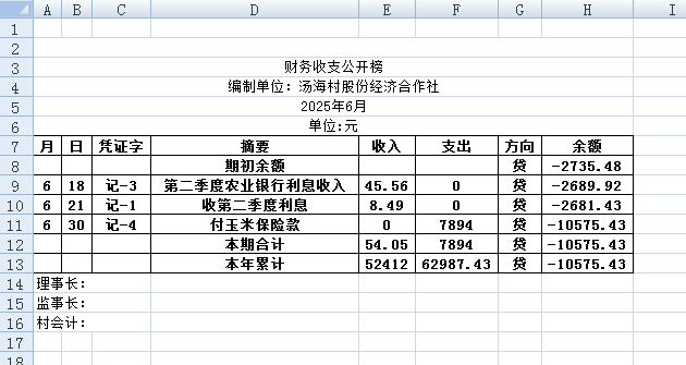 阿城镇汤海村2025年6月份账目收支明细表