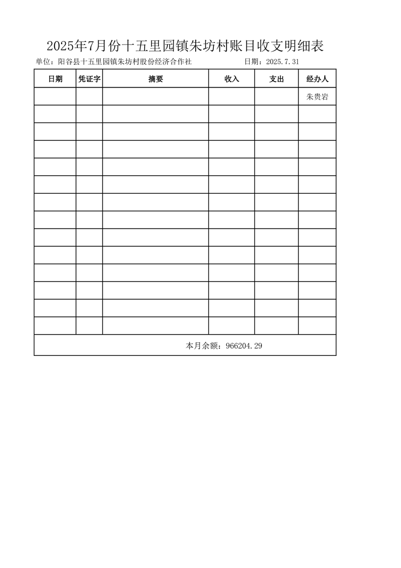 2025年7月份十五里园镇朱坊村账目收支明细表