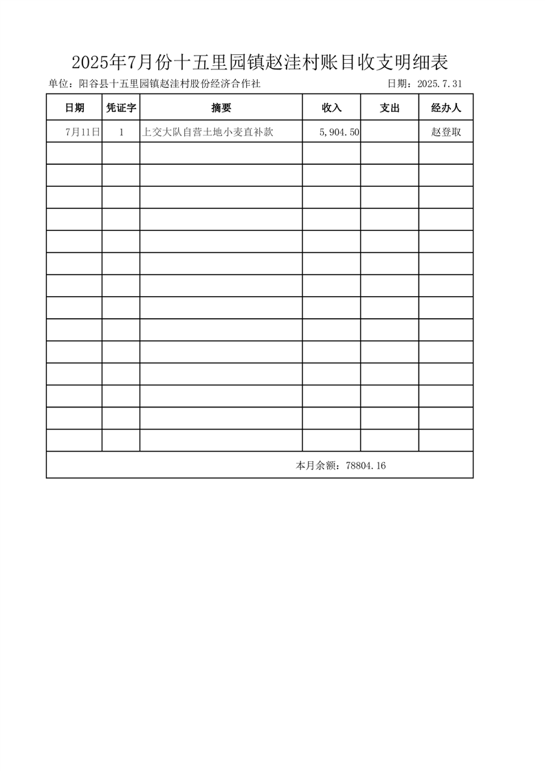 2025年7月份十五里园镇赵洼村账目收支明细表