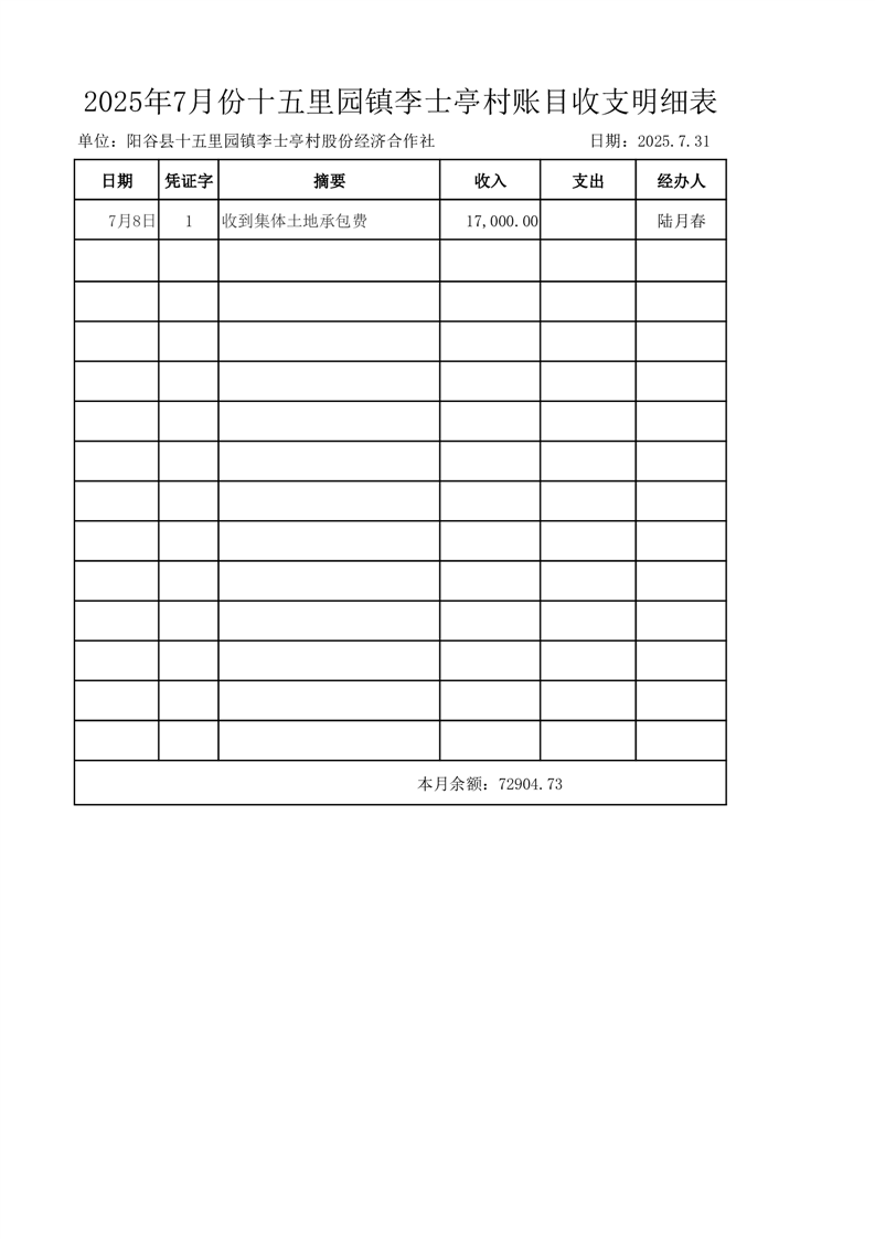 2025年7月份十五里园镇李士亭村账目收支明细表