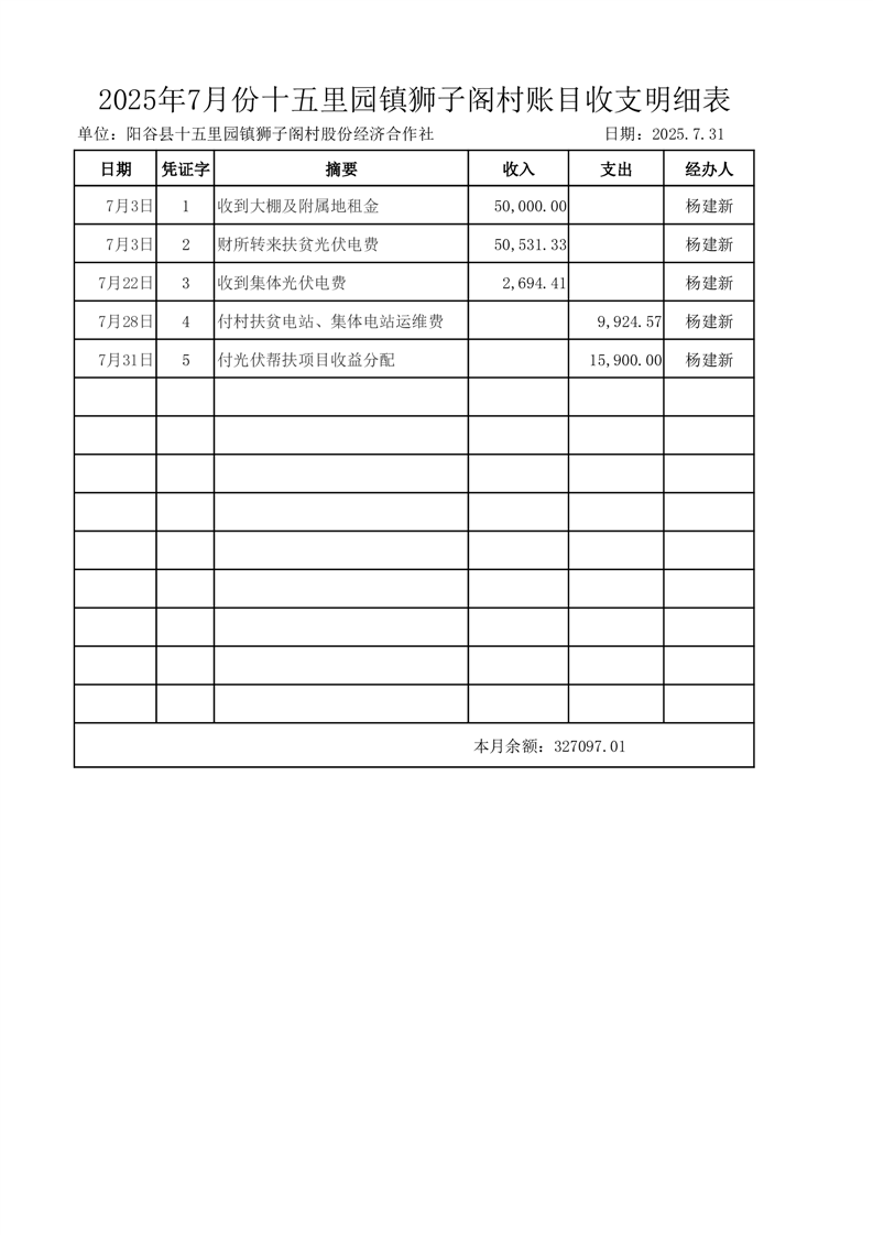 2025年7月份十五里园镇狮子阁村账目收支明细表