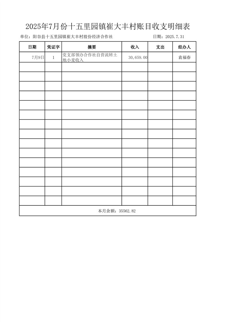 2025年7月份十五里园镇崔大丰村账目收支明细表