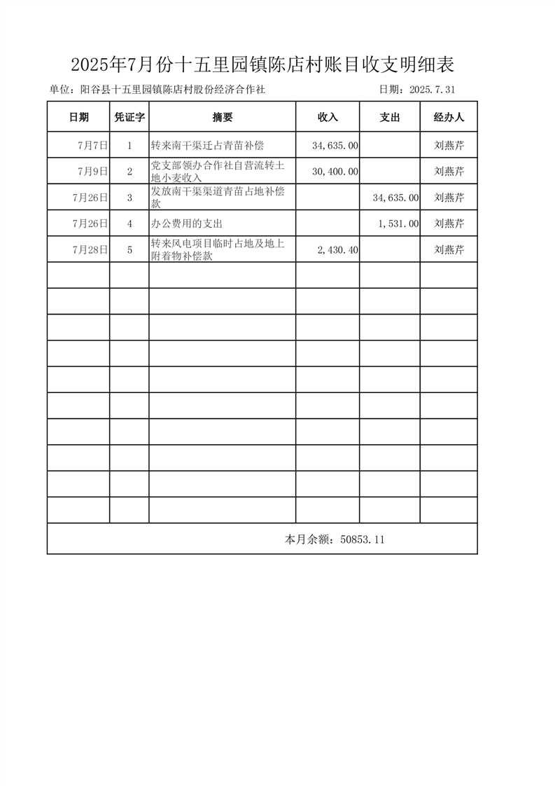 2025年7月份十五里园镇陈店村账目收支明细表