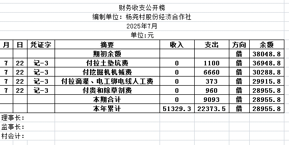 阿城镇杨尧村2025年7月份账目收支明细表