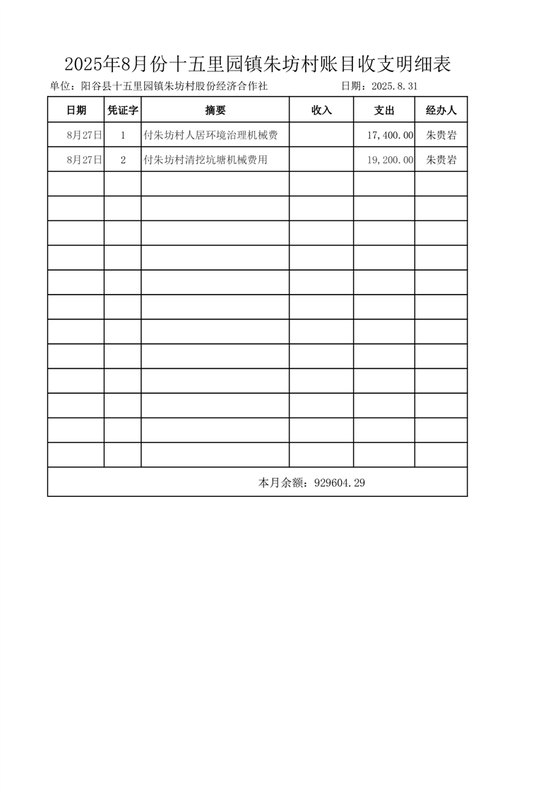 2025年8月份十五里园镇朱坊村账目收支明细表