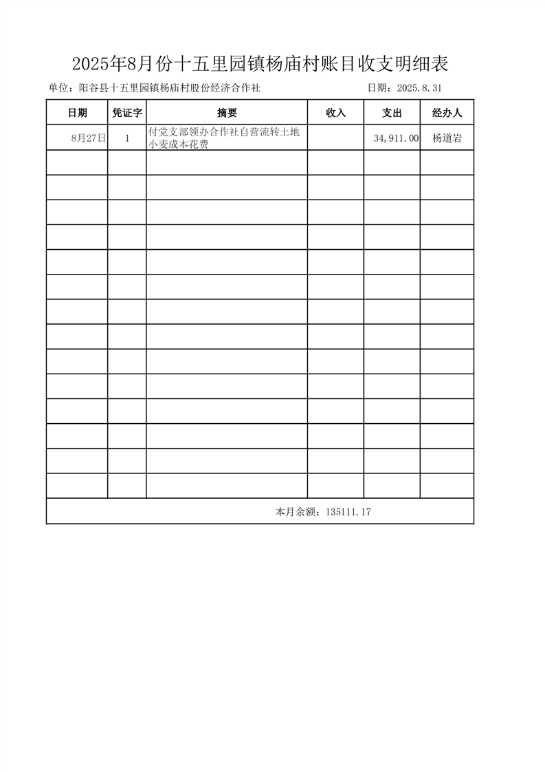 2025年8月份十五里园镇杨庙村账目收支明细表