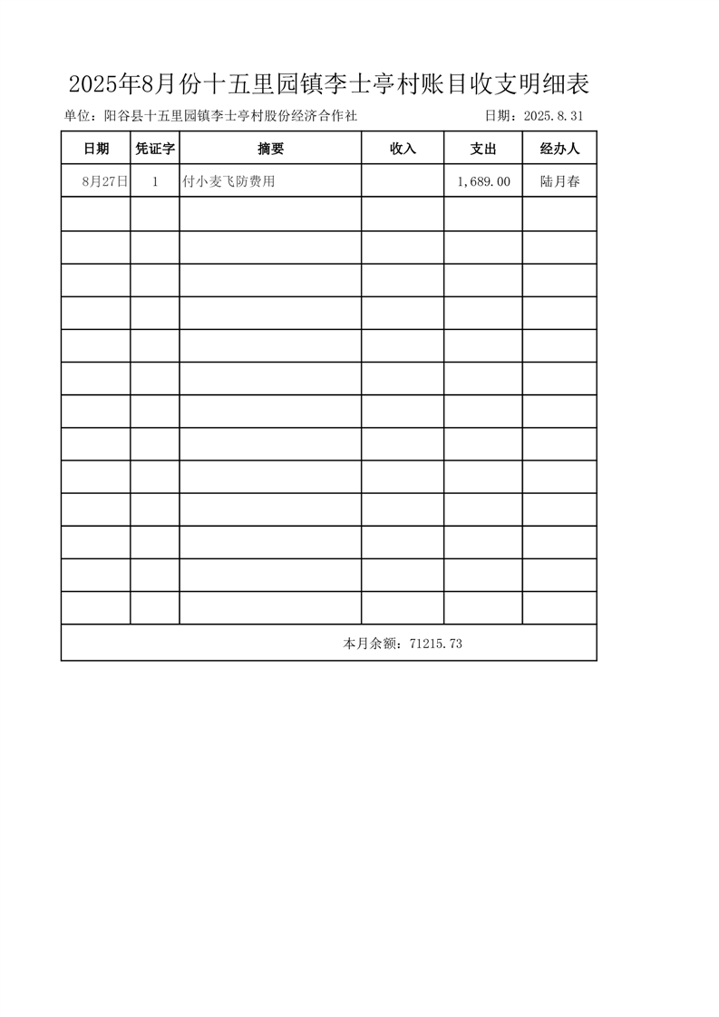 2025年8月份十五里园镇李士亭村账目收支明细表