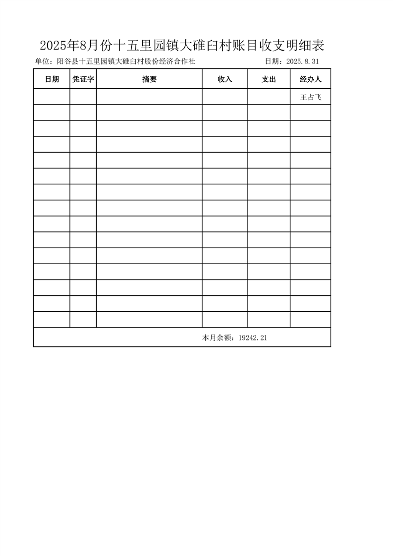 2025年8月份十五里园镇大碓臼村账目收支明细表