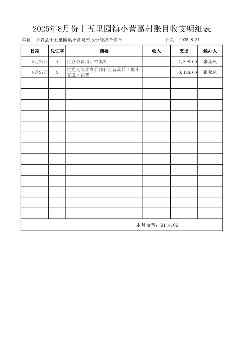 2025年8月份十五里园镇小营葛村账目收支明细表