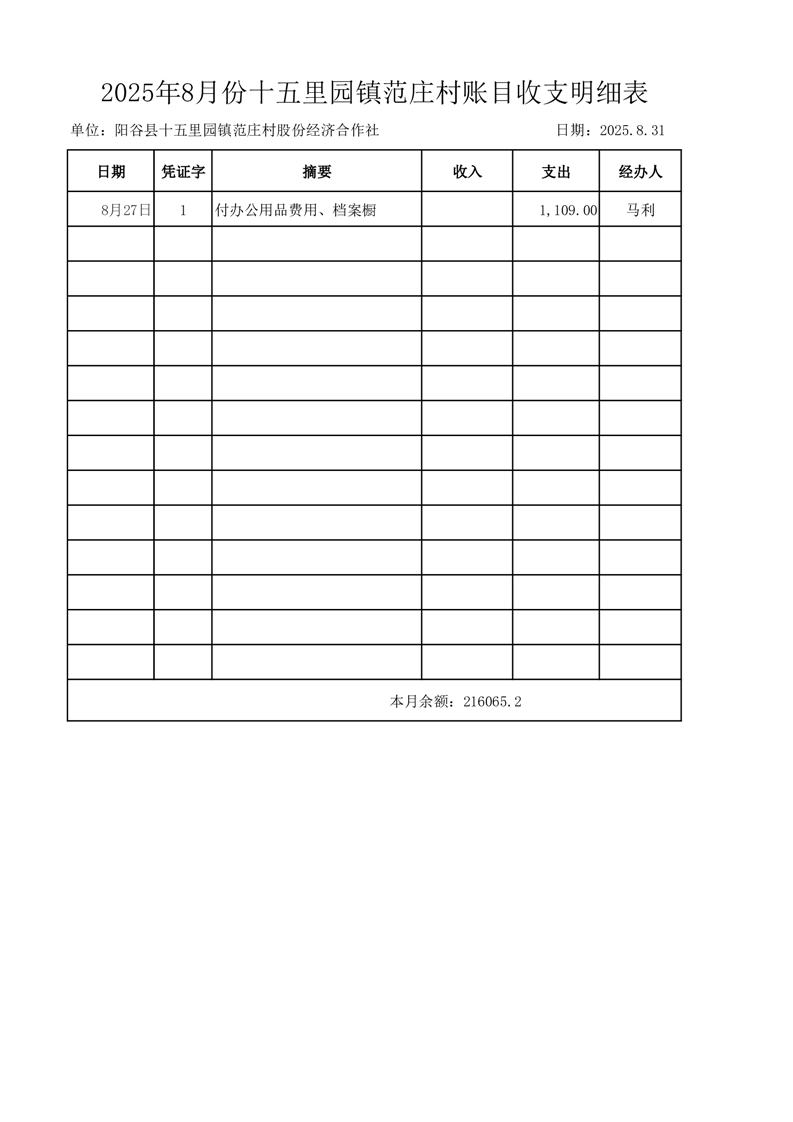 2025年8月份十五里园镇范庄村账目收支明细表