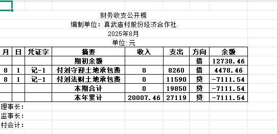 阿城镇真武庙村2025年8月份账目收支明细表