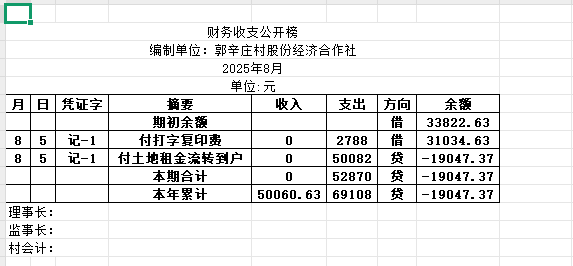 阿城镇郭辛庄村2025年8月份账目收支明细表