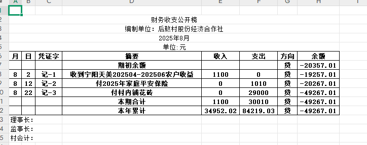 阿城镇后熬村2025年8月份账目收支明细表