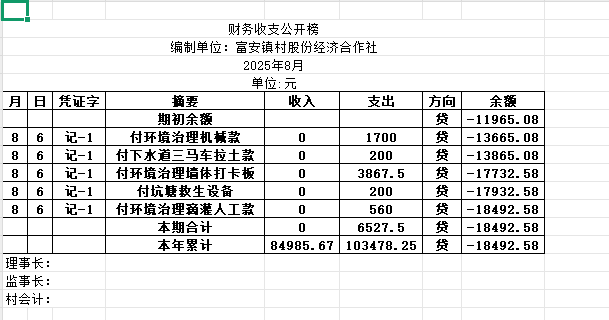 阿城镇富安镇村2025年8月份账目收支明细表
